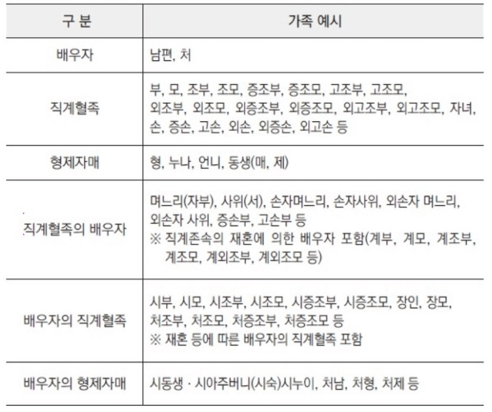 2. 법적으로 가족관계가 성립되어 있어야 합니다.( 나라에서 인정해주는 가족의 범위는 배우자, 배우자 직계혈통, 직계가족, 형제자매 등으로 제한됩니다.)