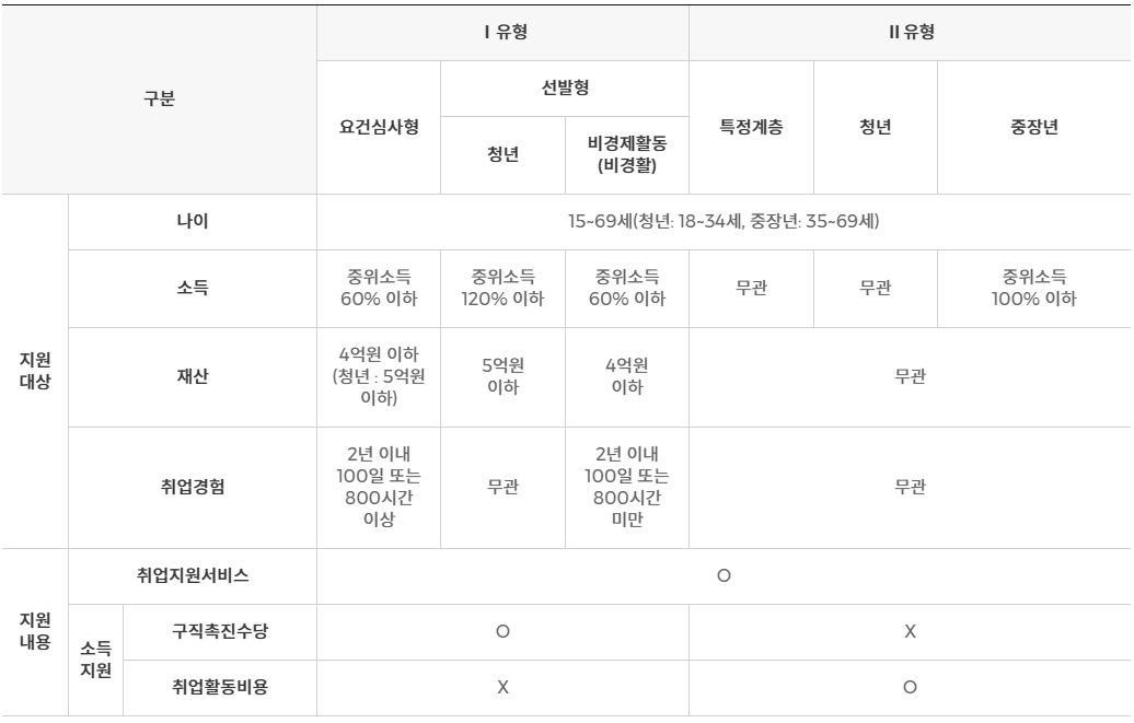 | 지원요건 | 요건심사형 : 15~69세 구직자 중에서 가구단위 중위소득 60% 이하이며 재산 4억원(18~34세 청년은 5억원)이하며, 최근 2년 안에 100일 혹은 800시간 이상의 취업경험이 있는 사람 중심 선발형 : 요건심사형 중에서 취업경험요건을 충족하지 못한 사람(단, 18~34세 청년은 가구단위 중위소득 120%이하며 재산 5억원 이하이며, 취업경험 무관) |