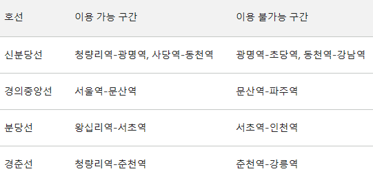 - 신분당선, 경의중앙선, 분당선, 경춘선: 서울시 내 구간만 무료 이용 가능 (구체적인 구간은 아래 표 참고)
