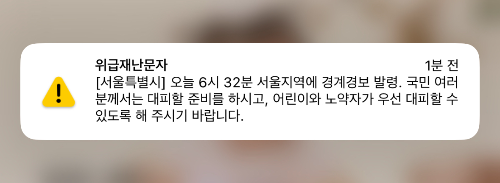 지진이나 심각한 자연재해등 있을 때 발행하는 재난문자가 와서 너무 놀랐습니다.