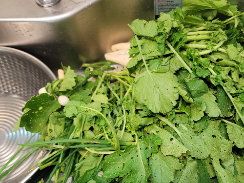 저희는 주말에 양평으로 가서 농사를 짓습니다. 많은 양은 아니지만 그렇다고 한 가족이 먹기 적은 양도 아닌 땅을 일구고 있는데요. 이번주에도 어김없이 농장으로 가서 채소를 수확해 왔습니다. 사실 농사를 짓는 건 신랑이 하고 저는 아이들과 시간을 보내거나 농막(말이 농막이지 아무것도 없는 깡통 컨테이너입니다) 안을 정리하거나 야채를 수확하거나 하고 있습니다. 총각무가 수확할 시기가 아직 아닌 것 같은데 꽃대가 올라와 어쩔 수 없이 수확을 해왔습니다. (꽃대가 올라오면 무에 심이 생겨서 맛이 없어진다고 합니다.) 시기보다 일찍 수확을 한 탓에 무 지만 무가 너무 적어 그냥 이파리나 먹자며 잎 겉절이를 해보았습니다.