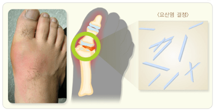 바람만 불어도 아프다고 해서 지어진 이름이 통풍입니다. 이 통풍이 생기는 이유는 높은 요산염 수치 때문인데요. 이 요산이라는 것은 음식이 몸속 대사작용을 통해서 마지막으로 만들어지는 결정체입니다. 요산은 직립보행에 필요한 혈압을 유지하며 지능 발달에 필수적인 성분입니다. 하지만 너무 많이 만들어지게 되면 몸속에서 요산들이 바늘모양으로 뭉쳐지게 되는데 이 바늘모양의 요산 결정체가 관절이나 장기에 쌓여 염증을 일으키고 심한 통증을 만들어내는 것입니다.