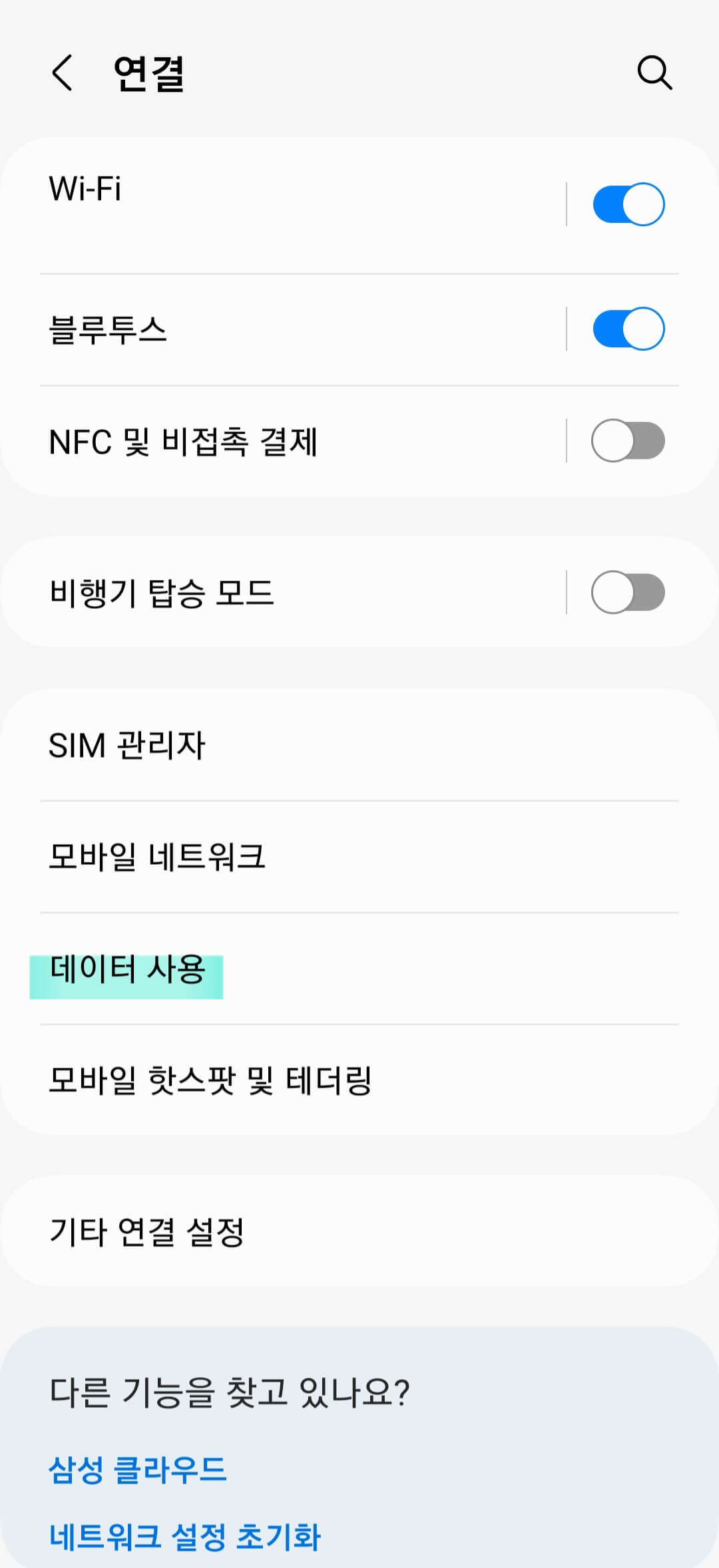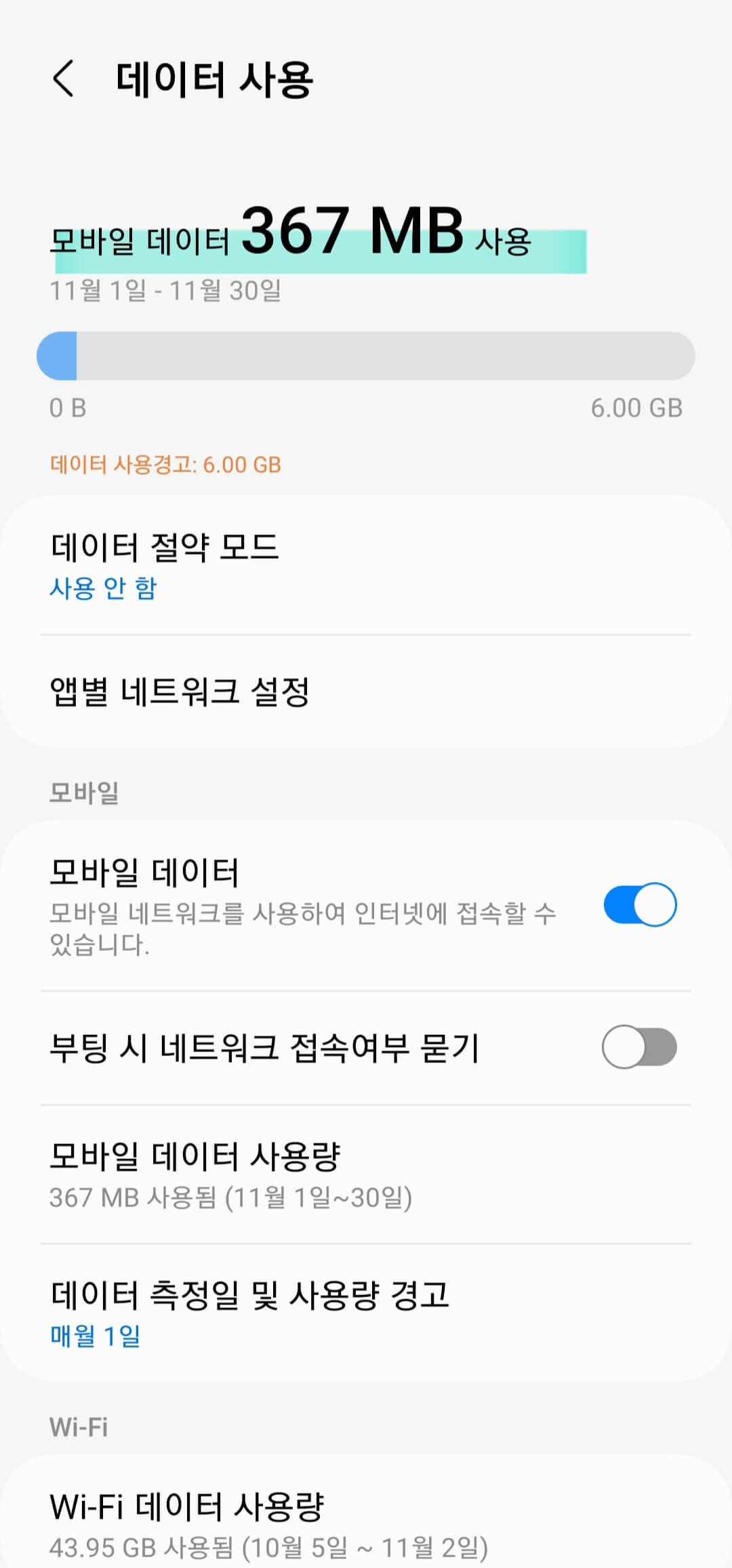 설정->연결->데이터 사용-> 모바일 데이터 사용량을 보시면 바로 확인하실 수 있습니다.