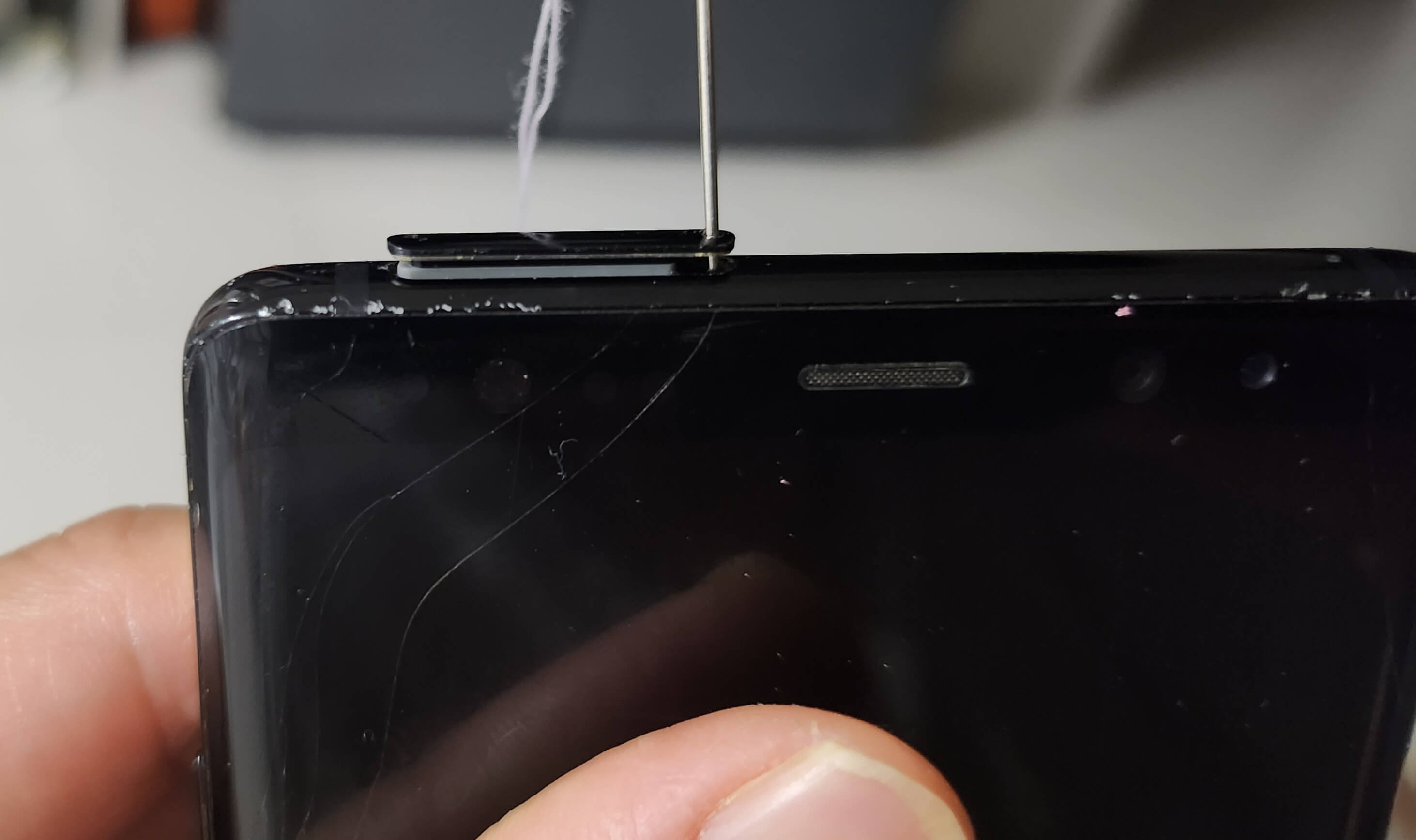 2.유심칩 구매시 같이 동봉되어있는 핀셋으로 핸드폰의 유심트레이를 빼냅니다.