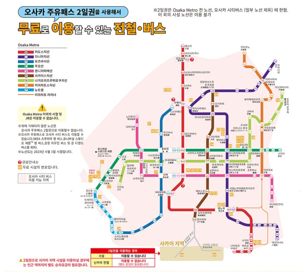 노선도도 1일차와 2일 차가 다르며, 1일권에서만 한큐, 한신, 게이한, 긴테츠 전철이 이용 가능합니다. 오사카 시티버스 역시 이용가능하지만 JR은 이용할 수 없습니다. 오사카 내에만 계신다면 2일권으로도 충분합니다.