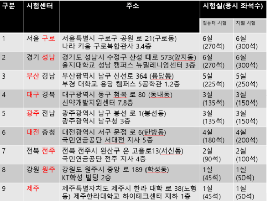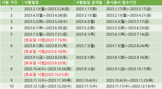 - 시험은 하루에 두번(오전, 오후), 주 5일 시행됩니다.(단, 하반기 중에서 토요시험은 월1회에 한해 오전에도 시행합니다.)