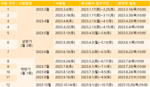 - 시험은 총 12회이며, 상반기는 월 2회, 하반기 월 1회 하루2번(오전/오후)에 시행합니다.