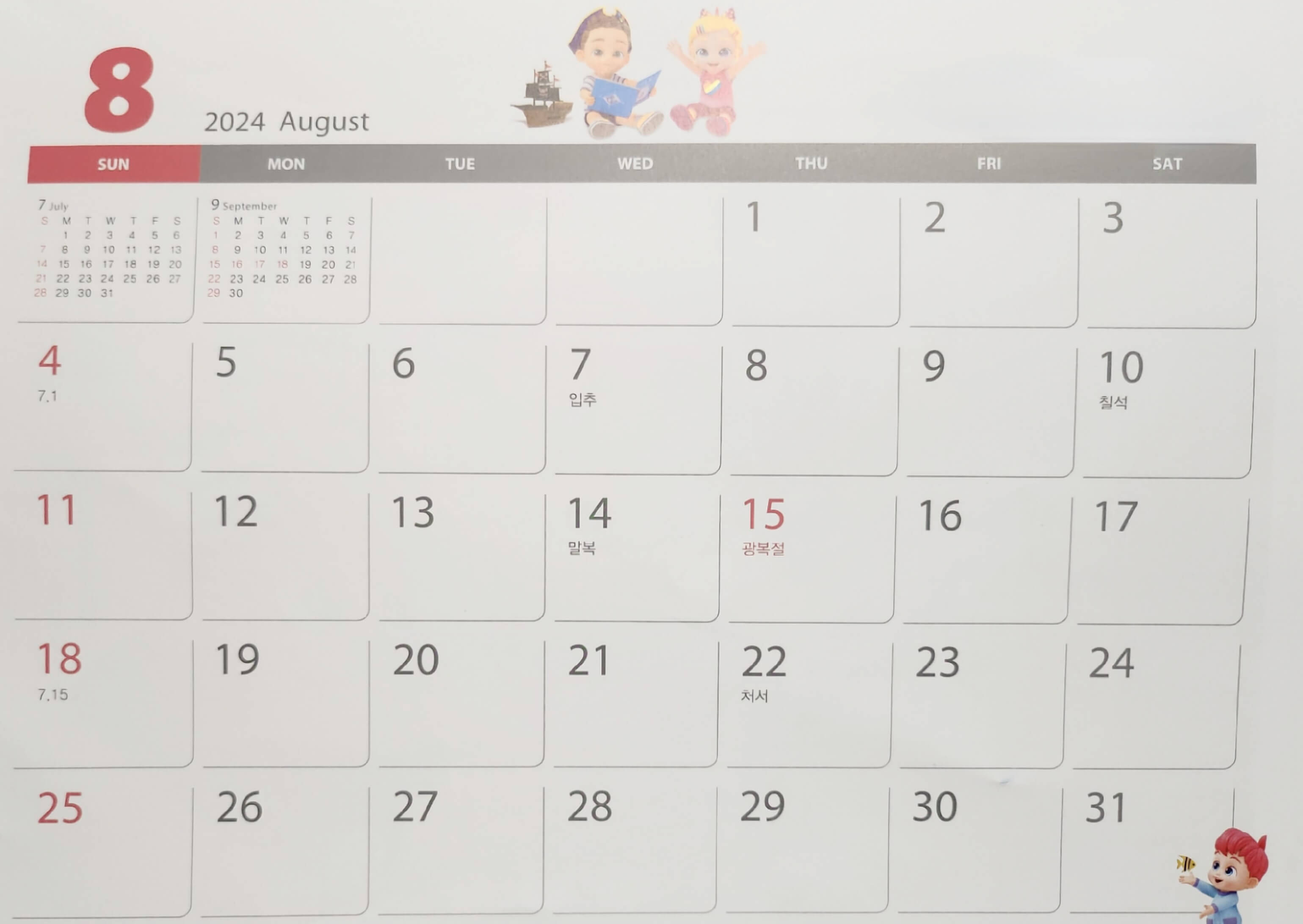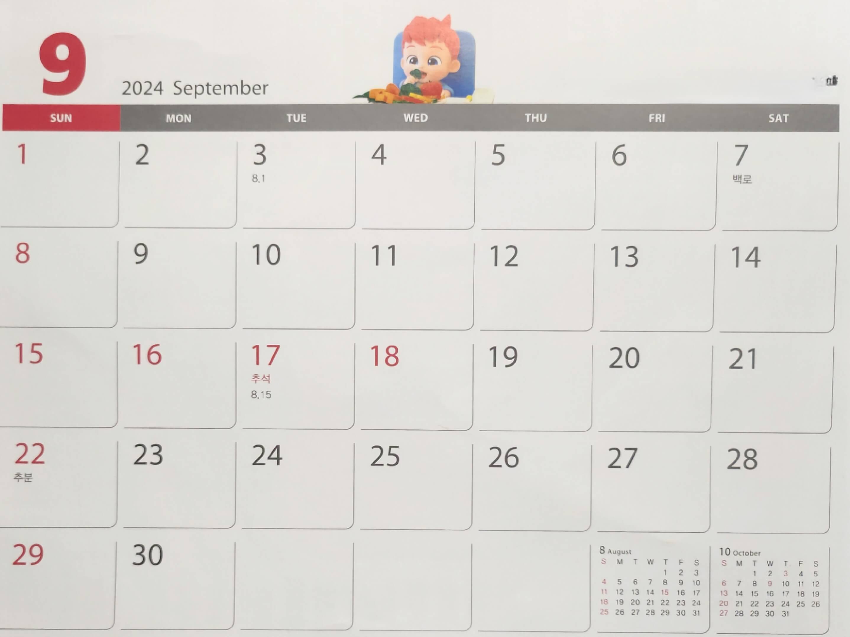 - 9월(5일) : 9월 17일 추석(토요일부터 추석 다음날 휴일까지 총 5일)