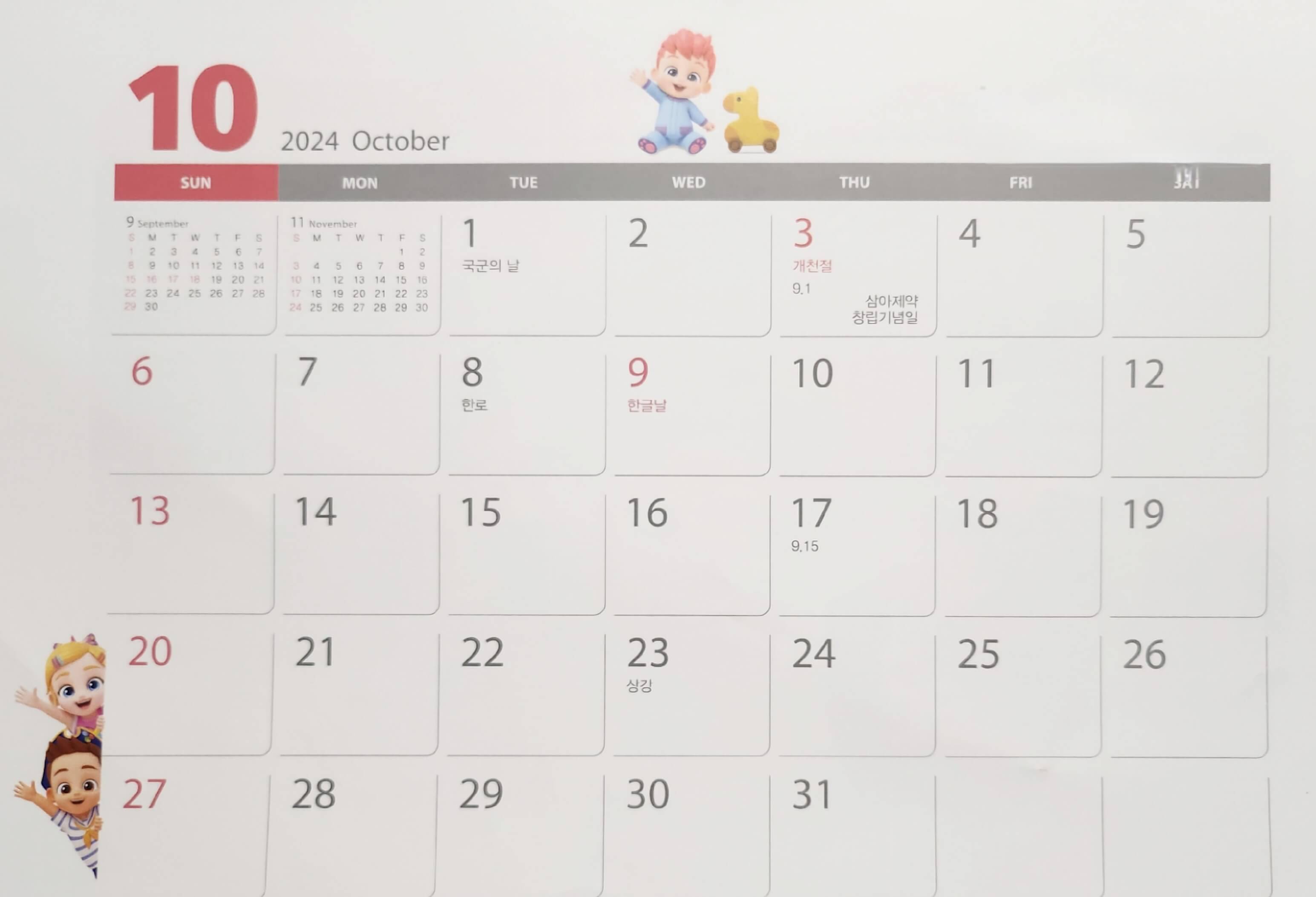 - 10월(2일) : 10월 3일 목요일 개천절, 10월 9일 수요일 한글날